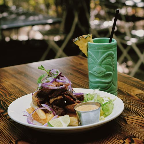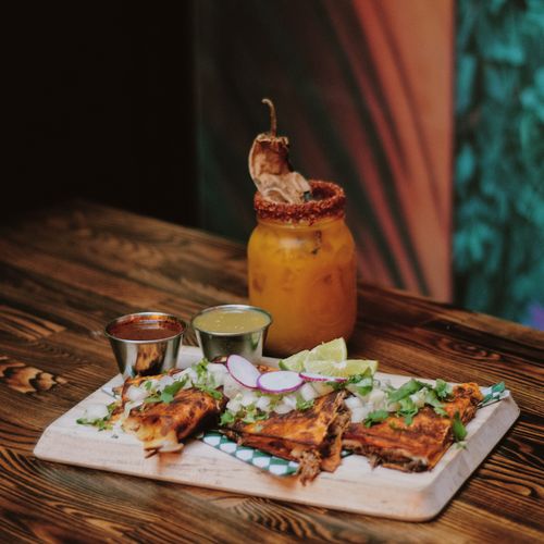 Two soft corn tortillas topped with tomatillo, melted cheese, sour cream and onions, stuffed with cilantro chicken, steak or carnitas. Veggie option available.